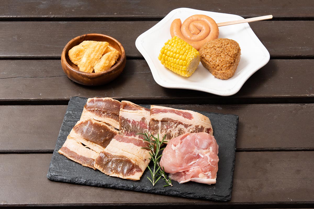 牛・豚・鳥が勢揃いの定番BBQ食材!野菜や焼きそばもセットになったお悩み知らずのセット商品。お肉も野菜もカットされているので〝包丁いらず″、会場に到着して即BBQスタート!