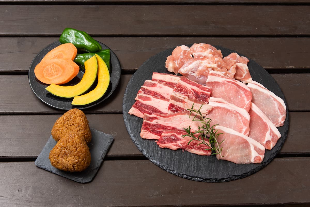 牛肉・豚肉・鳥肉が勢揃いで、カット野菜・焼きおにぎり付きの、団体お得食材プランです。お肉も野菜もカットされているので〝包丁いらず″、会場に到着して即BBQスタート!しかも肉だけで300gの大容量♪30名以上の団体が対象となり、人数分のご用意が可能です。
